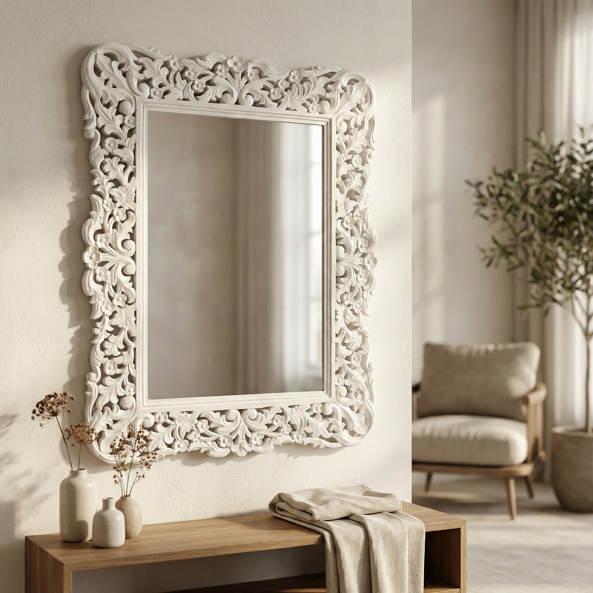 Hand Carved Mirror "Medewi" - White - 90 cm