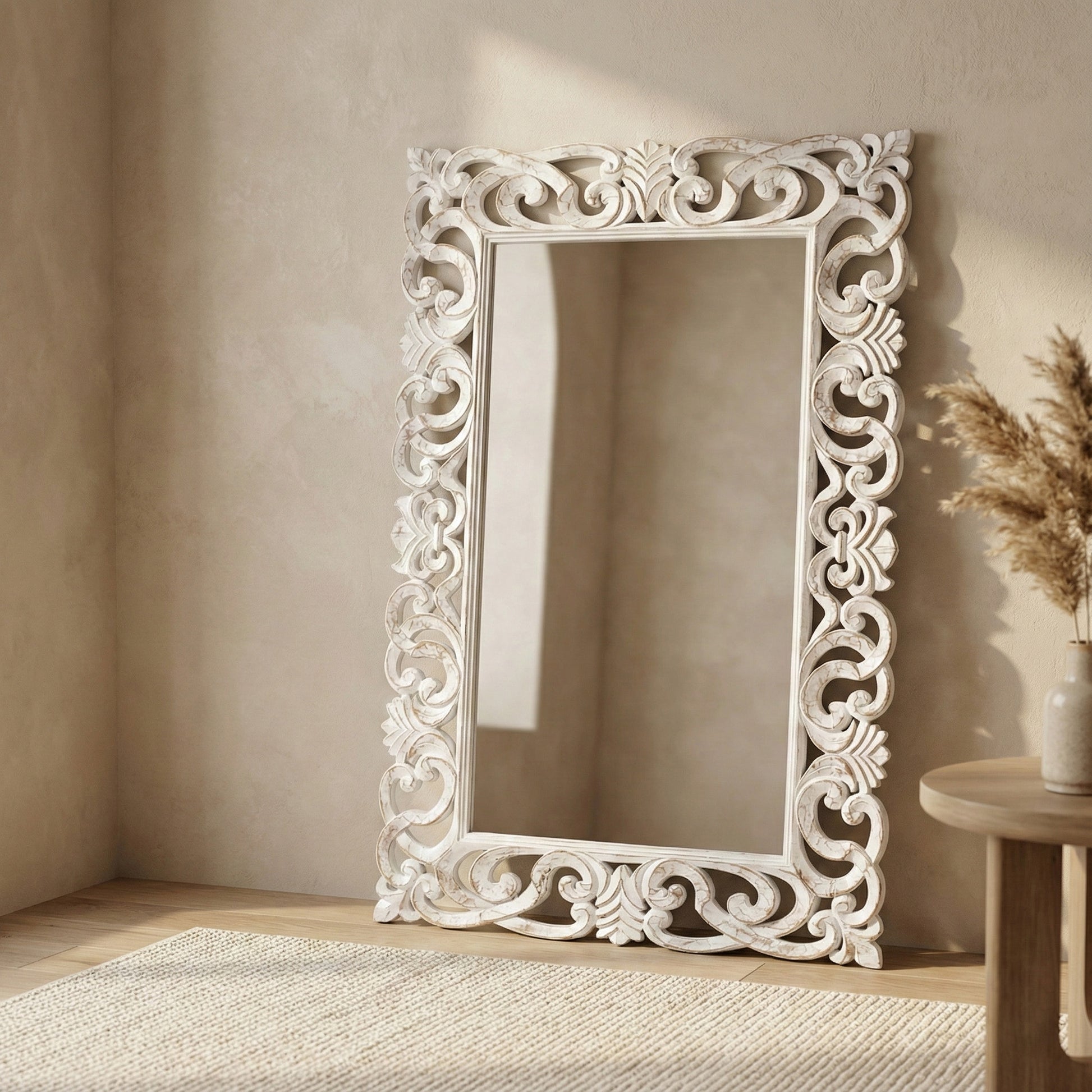 Hand Carved Mirror "Cahaya" in Antic Wash - 150 cm